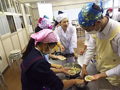 栄養教諭の武田先生とteam teachingで授業を展開しました。ICT機器を有効に活用し、動画で分かりやすく手順を説明をしていました。