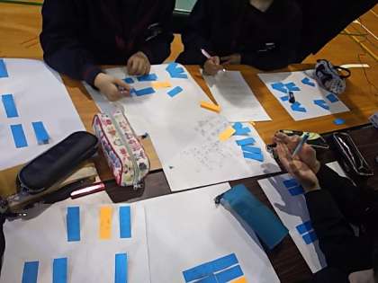 避難してきた人を付箋であらわし、誘導した教室に付箋を貼っていきます。最後に、誘導をするのに困ったことや、どのようにすれば誘導しやすいかを発表しました。