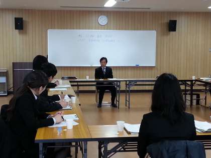 本校には、11名が来校し、学校の取り組みや登校から下校までの教育活動全般について、講話や参観をとおして研修しました。3・4限は、国語・社会・数学・理科の授業参観を行いました。