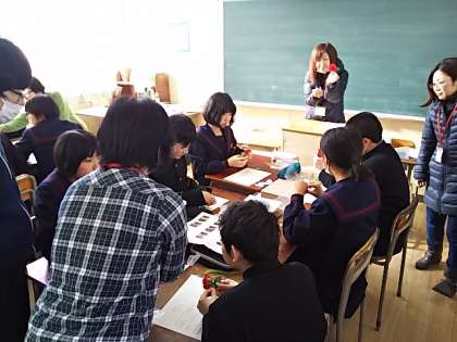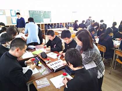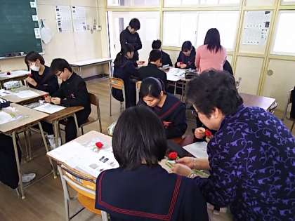 ボランティアの方々が各クラスに入り、コサージュ作成のお手伝いをしてくれました。