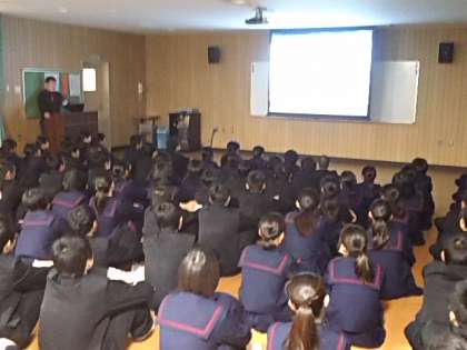 学年末テスト終了後、2年生は多目的室で学年集会を行いました。