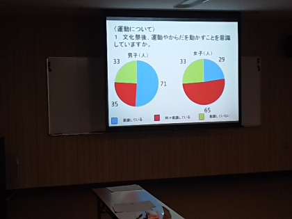今年度、生徒保健委員会では「運動」をテーマに調査を実施しました。調査報告を文化祭で発表したあとの「運動」についてのアンケート結果の報告がありました。