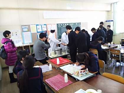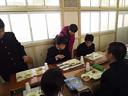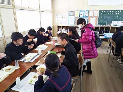 2年1組の生徒たちの配膳や喫食のようすを見ていただき、給食についての感想を取材されました。