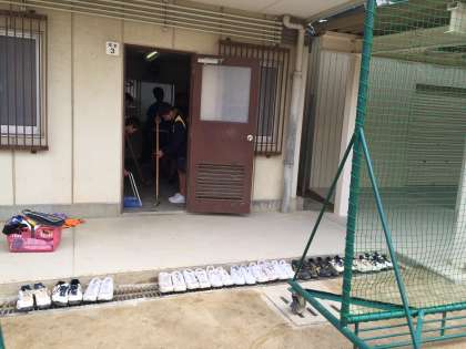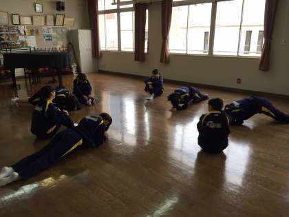 写真はスタビライゼーショントレーニングをする合唱部と掃除をするハンドボール部です。