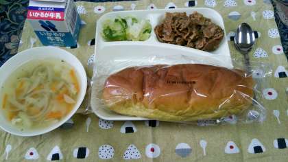 給食二日目。今日は豚肉のデミグラスソースにスープ、キャベツとピーマンのソテーでした。主食はパンです。