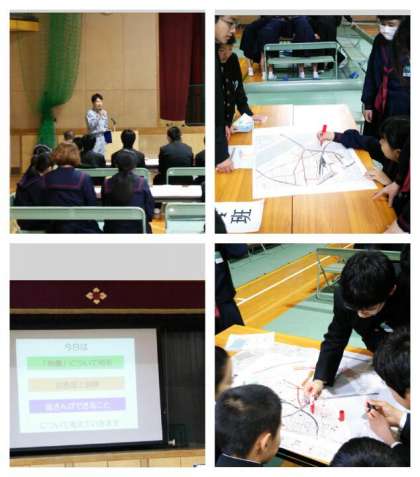 体育館では、北区の地域課防災担当と大阪市危機管理室担当からのご指導で映像とグループワークによる「災害図上訓練」が行われました。