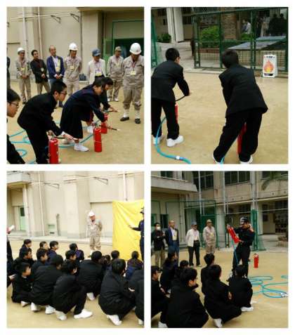 多目的室では、熊本震災の映像と運動場での煙体験と倒壊した建物からの救助法、そして身近にある消火器による水消化訓練が行われました。