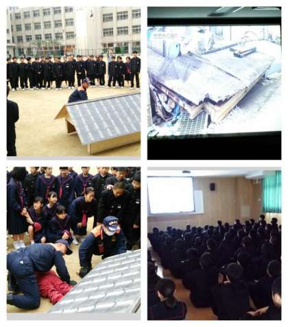 防災訓練では、学年単位で体育館、武道場、多目的室に分かれ実習訓練が行われました。