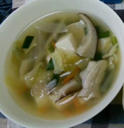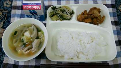 本日は鶏肉のからあげとチンゲンサイ・もやしの甘酢あえに中華スープが付いていました。から揚げは冷めてカラッとしていて、柔らかく調理されていました。中華スープには豚肉、にんじん、たまねぎ、キャベツ、しいたけ、お豆腐、にらが入ってとてもヘルシーでした。