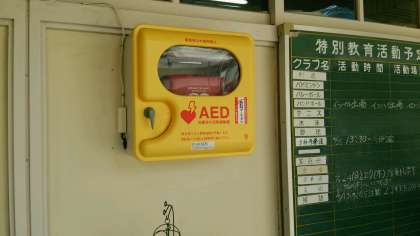 校内生徒の活動及び地域等で、AEDの必要があればいつでも使えるように職員室前に備え付けられています。
