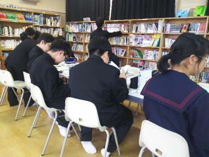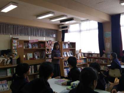 国語の授業で図書館のオリエンテーションを行いました。身近にありながら中に入ったことがないなど、意外と図書館を知らないものです。今日はそんな1年生のために、国語科の先生と図書館補助員が図書館の使い方や本の紹介を行いました。