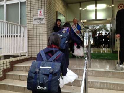 福岡県の「みやま市あいさつボランティア協会あいさつ大使」を務めておられる平岡三光(ひらおか さんこう)さんが来校され、登校時間のあいさつ運動に参加していただきました。平岡さんは、地元の小学校で毎朝あいさつをされています。大阪に来られたことを機に、雪の降る悪天候の中にもかかわらず、大きな明るい元気な声で、生徒たちにあいさつをかけていただきました。