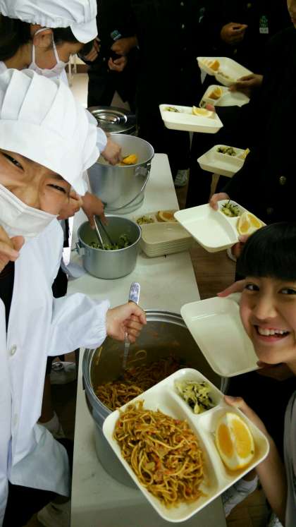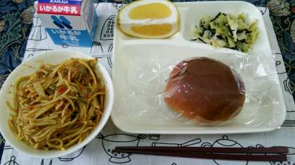 本日の給食は、カレースパゲティにキャベツのひじきドレッシングと河内ばんかんでした。河内バンカンとは柑橘類の一種でザボンの一品種です。たいへん甘く、食後お腹いっぱいであってもおいしくいただけました。