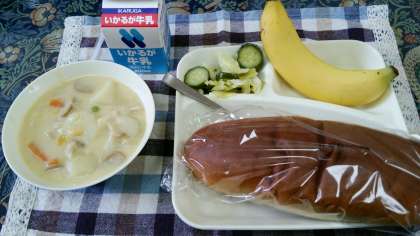 11日(木)の給食は、コーンクリーム・シチューにグリーンサラダとバナナでした。主食はパン。本日も鶏肉がシチューに入っていました。鶏肉は高たんぱく質で低脂肪の代表的な食材です。レシピ—が豊富で、今後も楽しみです。