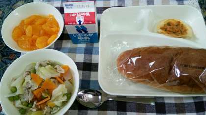 本日の給食は豚肉と野菜のスープ煮に、変わりピザと缶詰みかんが付いていました。