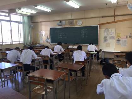 写真は2年1組の様子です。いつもより早く登校し、みんなで勉強しようとがんばっているようでした。3年1組でも理科ノートを広げて覚えなおしをしていました。