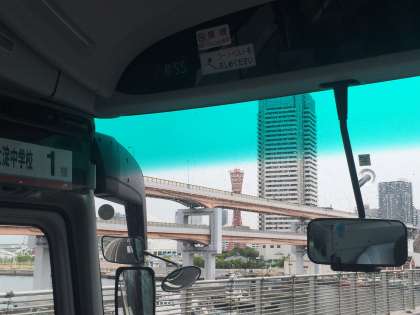 バスガイドさんに、神戸の歴史や地理について説明していただいています。
