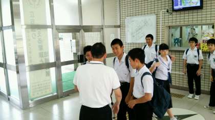 学校集合の班が教員の励ましをもらい出発です。