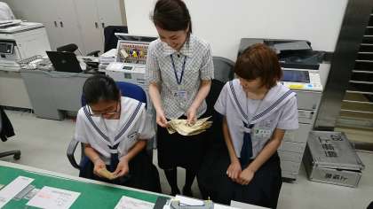 練習用のお札を使い、お札の広げ方や数え方を教わっていました。