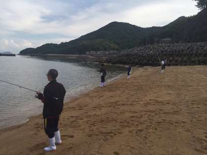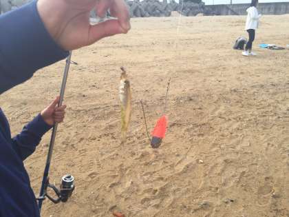 海に向かって竿をふり、今日の晩御飯を釣っています。ちょうどキスが釣れました。