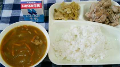 本日は、カレースープと鶏肉のガーリック焼きにサワーソテーがついていました。カレーとガーリックの香りは食べる前からどこからとなく我々の鼻に入ってきます。これからの暑い時期は、どうしても食欲が減退します。そのような時は、学校給食を参考に。本日も残食なしでした。