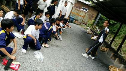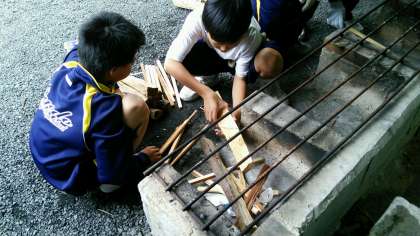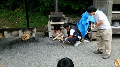 係生徒が火の付け方を学んでいます。君たちの責任は重大です。
