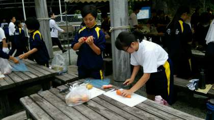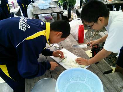 玉ねぎ、にんじん、じゃがいもなど、不慣れ手つきですが火の通りやすい大きさに切っています。指に気をつけて!!