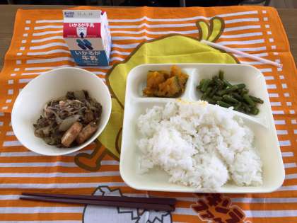 今日の給食は、すき焼き煮、焼きかぼちゃの甘みつかけ、三度豆のごま酢あえ、米飯です。