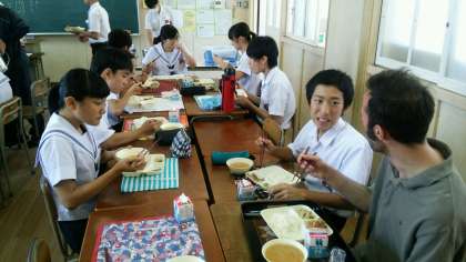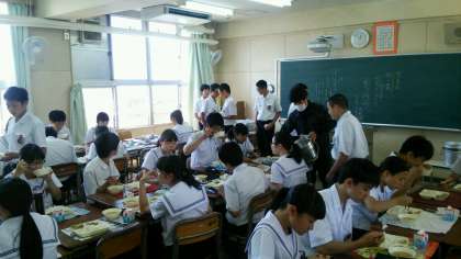 3-2ではC−NETのボブ先生が生徒に混ざって食事をしておられました。