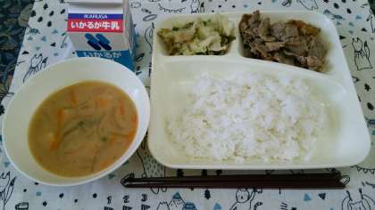 本日は豚肉のおろしじょうゆがけとみそ汁に野菜いためが付いていました。