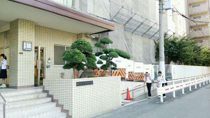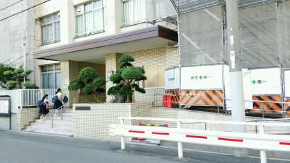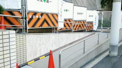 今年度、大淀中学校内で大きな工事が三ヶ所で行われます。早速この三連休中に校門横スロープに足場が組まれました。