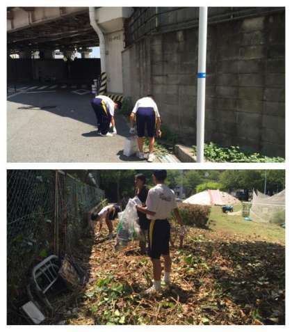 暑い中、生徒は蚊に刺されながら草むらに入りごみを拾います。