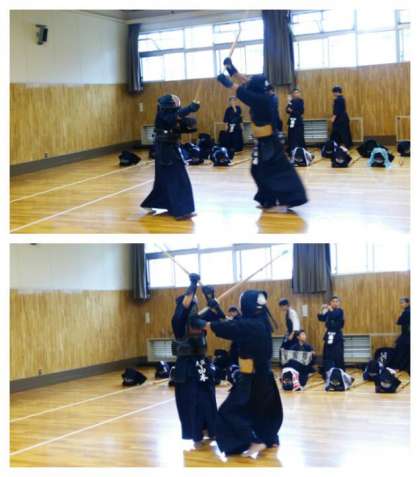 生徒の休憩時間を利用し、二人の顧問が試合を披露。二人とも有段者です。男性と女性。体格差はあるものの、竹刀を交わす数やスピードは互角。大きな声を出して飛び込む姿は大迫力の連続でした。