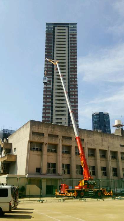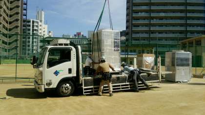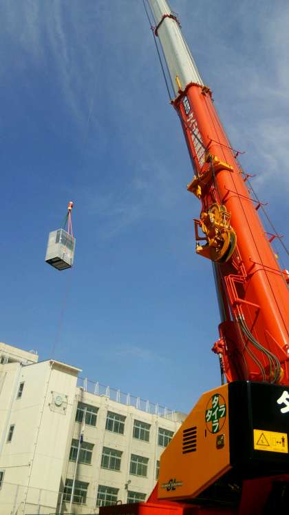 体育館棟等に新しい室外機がクレーン車で吊り上げられ設置されました。