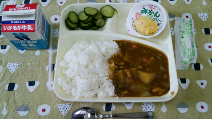 本日はチキンカレーライスをメインに、きゅうりのピクルスとデザートにみかんゼリーが付いていました。カレーの具材は鶏肉を中心に、じゃがいも、玉ねぎ、人参、グリーンピース、にんにくがたくさん入っていました。