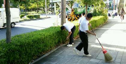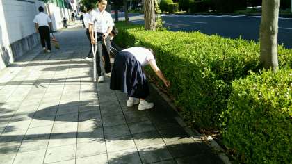 雨上がりの朝、恒例の朝清掃を行っています。昨日までの雨で湿った街路樹低木に手を突っ込みゴミを取り出します。