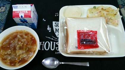 本日は、エビグラタンにトマトスープと二十世紀なしが付いていました。