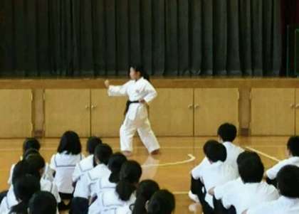 2年生女子 森さんが空手の型(抜塞大)を学年集会で披露していました。