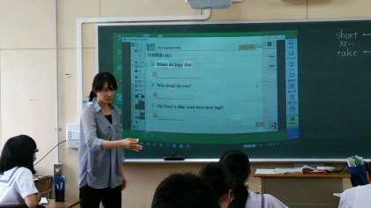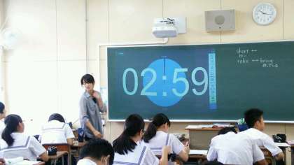 二年生の英語では黒板にプロジェクターでタイマーが映し出され、制限時間内に課題をこなします。また、黒板に映し出され問題に小橋先生が正解を書き込んでいきます。ICT を活用した授業で効率的に進められていました。