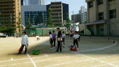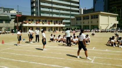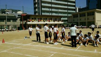 係り生徒の役割の確認やリレーのバトンパスルールの確認など体育科先生から説明を聞きます。予行の大事な目的の一つです。