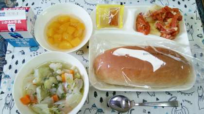 本日は、鶏肉とてぼ豆のスープ煮とじゃがいもとトマトのチーズ焼き、黄桃でした。