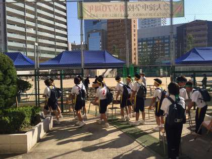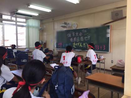 各教室では、ゼッケンをつけハチマキを巻き準備万端です。