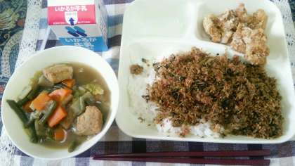 本日は、鶏肉のたつあげにあつあげと野菜の煮ものと、ご飯に振りかけるおかかなっ葉でした。