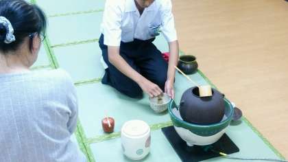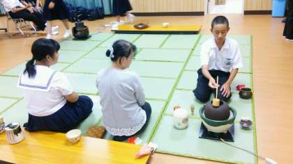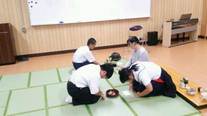 多目的室で活動中の茶道部の様子です。地域ボランティアからお手前の指導を受けています。静かな部屋に気持ちの良い緊張感が漂っていました。文化祭で是非その活動をご覧ください。