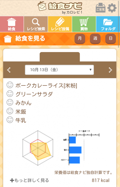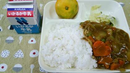 今日はポークカレーライスでした。グリーンサラダとみかんが付いていました。