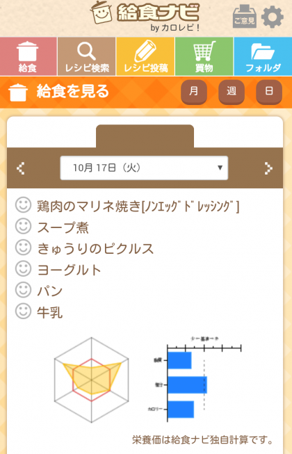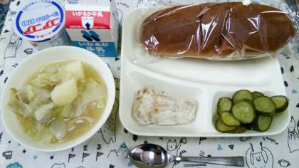 今日は鶏肉のマリネ焼きに、きゅうりのピクルスとスープ煮でした。また、牛乳とは別に発酵乳のヨーグルトが付いていました。