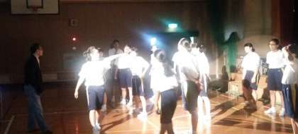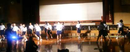 体育館では2年生の劇練習が進められています。中学生男女の恋愛物語の一コマでしょうか? マイケルジャクソンの曲に合わせ、女子がリズミカルに踊っています。リーダーが曲を止め、入り方や立ち位置の確認をします。