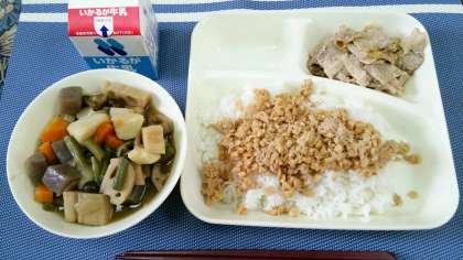 本日は豚肉のねぎだれかけとふきよせ煮でした。ご飯にはツナ大豆そぼろが付いていました。ふきよせ煮の野菜の量にビックリ。凄いボリュームです。栄養満点でした。