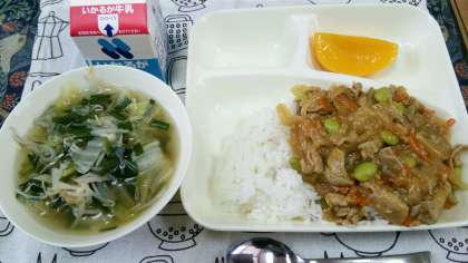 本日は、ピリ辛丼に中華スープと缶詰黄桃でした。