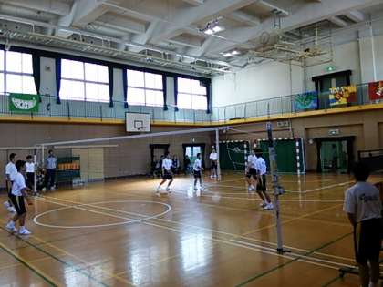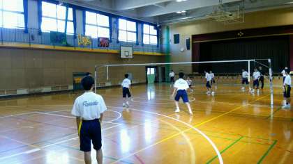 サーブからレシーブ、アタックの三段攻撃を目標に取り組んでいますが、バレーボールは難しですね。手に持ったり、地面に落下すればゲームは止まります。そこをチームで協力し防がなければなりません。そんな生徒たちの取り組んでいる姿を目にし、小学校の先生も喜んでおられました。もっともっと上手くなりましょう。